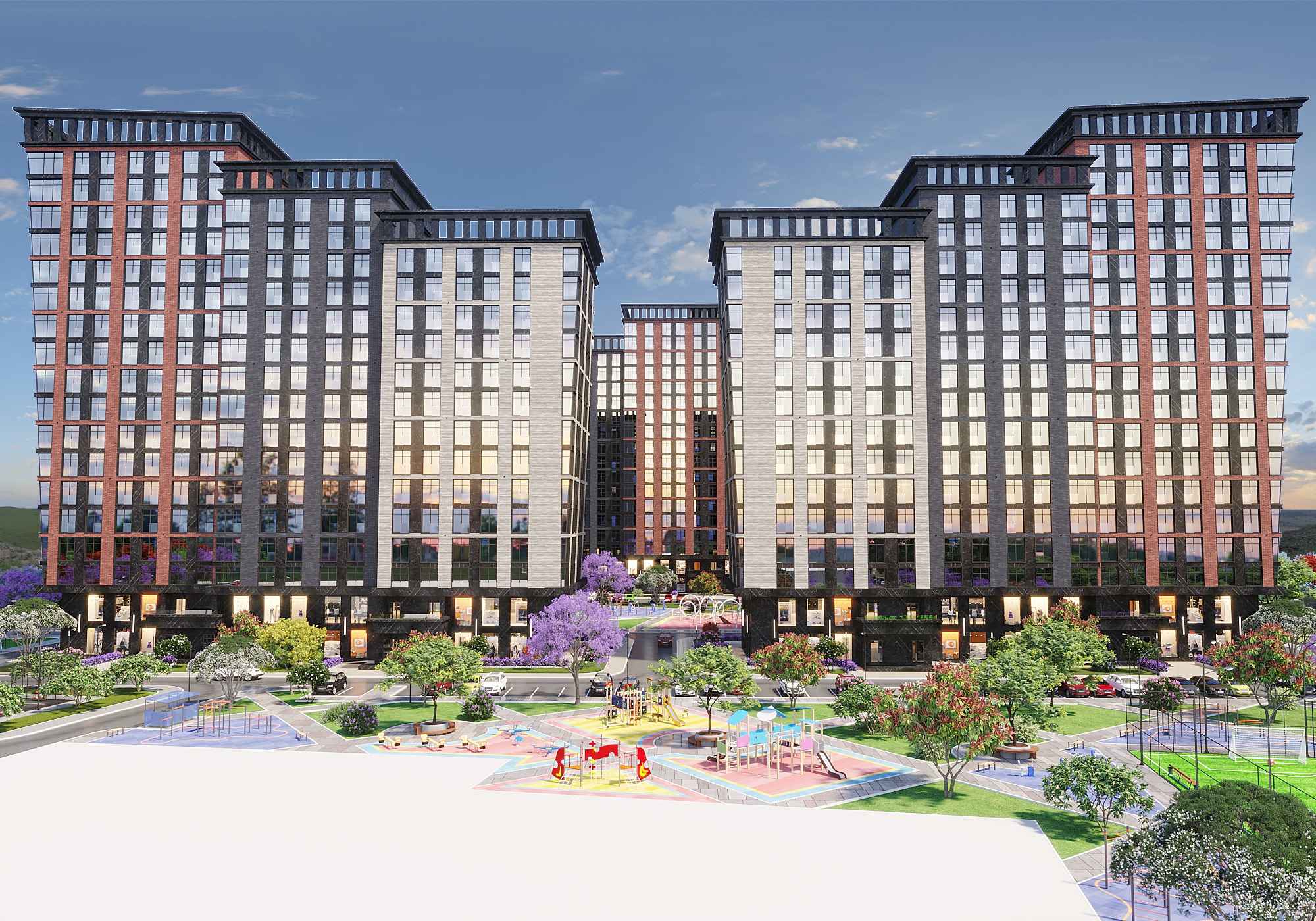 Премиальный жилой комплекс с уникальной архитектурой. ЖК террасного типа включает несколько корпусов переменной этажности. Фасады выполнены в сдержанном стиле.